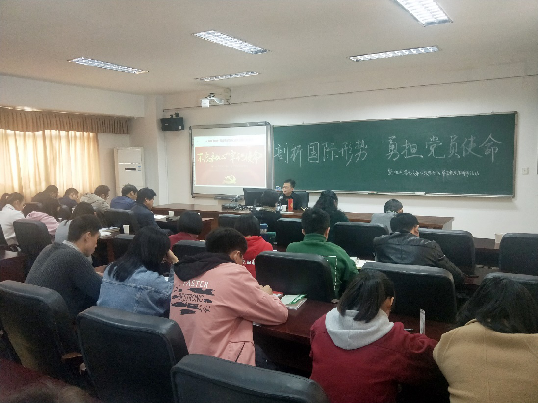 本站讯 11月22日下午14:00于5511,机关第九党支部牵手开云kaiyun官方网站学生党支部,顺利开展“剖析国际形势、勇担党员使命”主题党日活动。机关第九支部全体党员、开云kaiyun官方网站党总支副书记易政群同志出席,开云kaiyun官方网站学生党支部全体党员参加。此次主题当日活动以讲党课的形式开展,易政群同志主持,周旭进同志主讲。