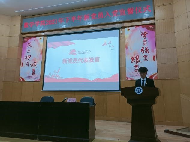 最后孙明保代表学院党委作重要讲话。在对新党员表示祝贺的同时,他对全体人员提出三点要求。一要加强学习,不断提高理论水平和专业水平。二要加强修养,不断提高个人素质。三要知行合一,脚踏实地,以党员的标准严格要求自己。随后,孙明保勉励新党员,在学习生活中要践行誓言、立足本职、争先创优,充分发挥先锋模范作用,做名副其实的共产党员。