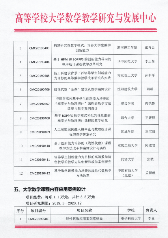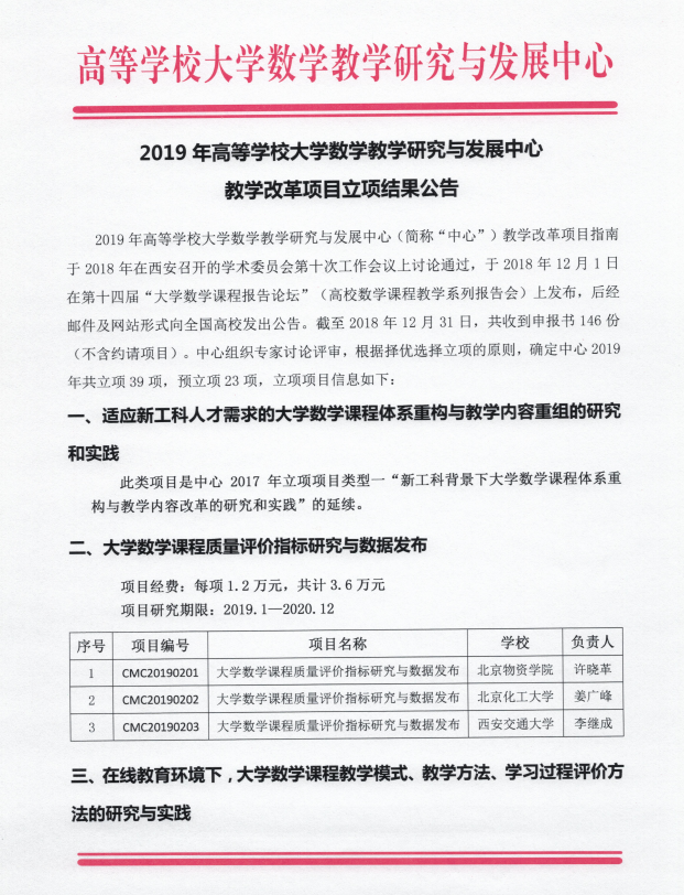 3月20日教育部高等学校大学数学教育与研究发展中心发表立项结果公告,开云张再云教授申报的“构建研究性教学模式,培养大学生数学创新能力”项目获得立项支持。