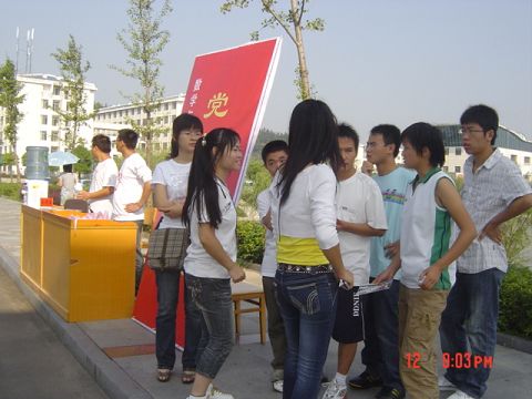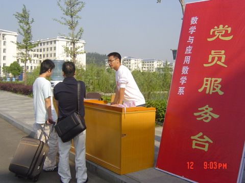 9月12日,数学系迎来了第一个迎新工作日,为了具体地落实院党委和系党总支的指导精神,数学系成立了学生党支部迎新活动团队,在南院大门口搭建数学系学生党员迎新咨询服务台,热情周到地为08级新生提供各方面的服务。