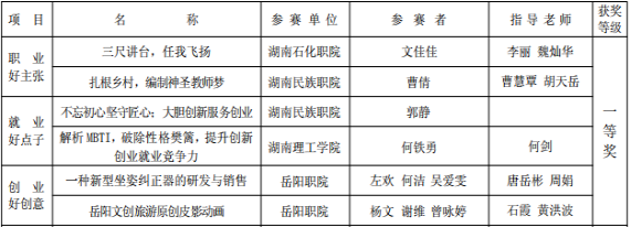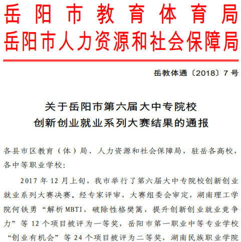 去年12月上旬,岳阳市举行了第六届大中专院校创新创业就业系列大赛决赛。大赛分为“职业好主张”、“创业好创意”、“就业好点子”三个赛项,分别着眼于学生职业规划、学生创业和教师创新创业课教法。各赛项分中职和高校组。经专家评审,大赛组委会审定,开云教师何铁勇“解析MBTI,破除性格樊篱,提升创新创业就业竞争力”荣获‘就业好点子’项目一等奖。