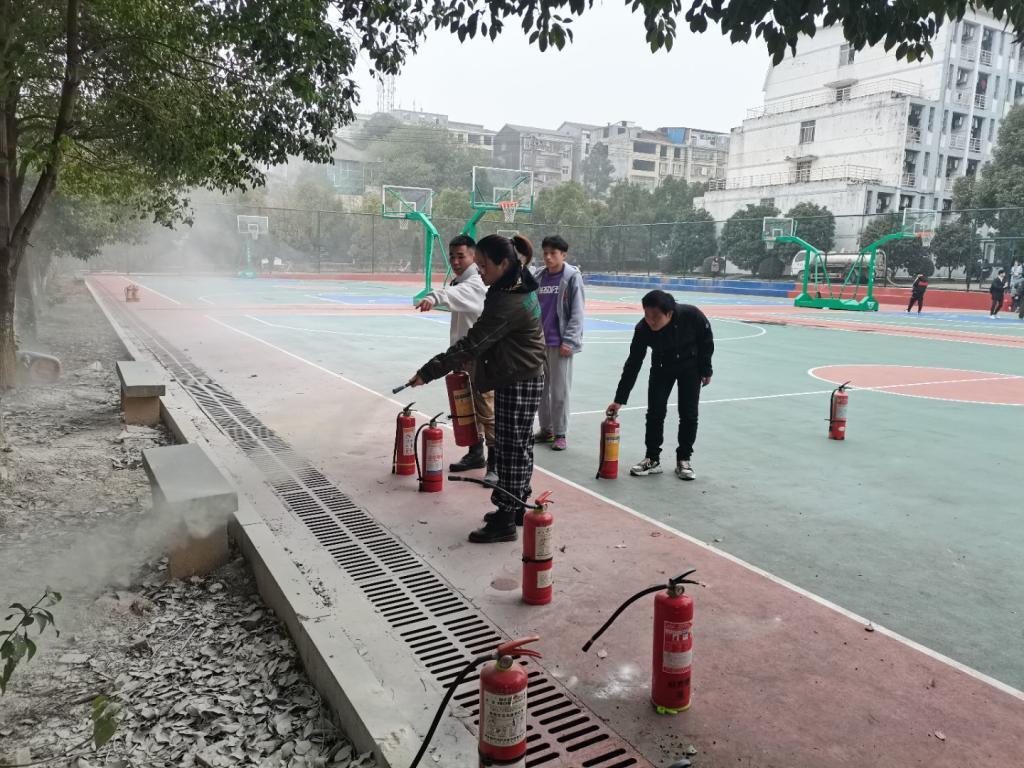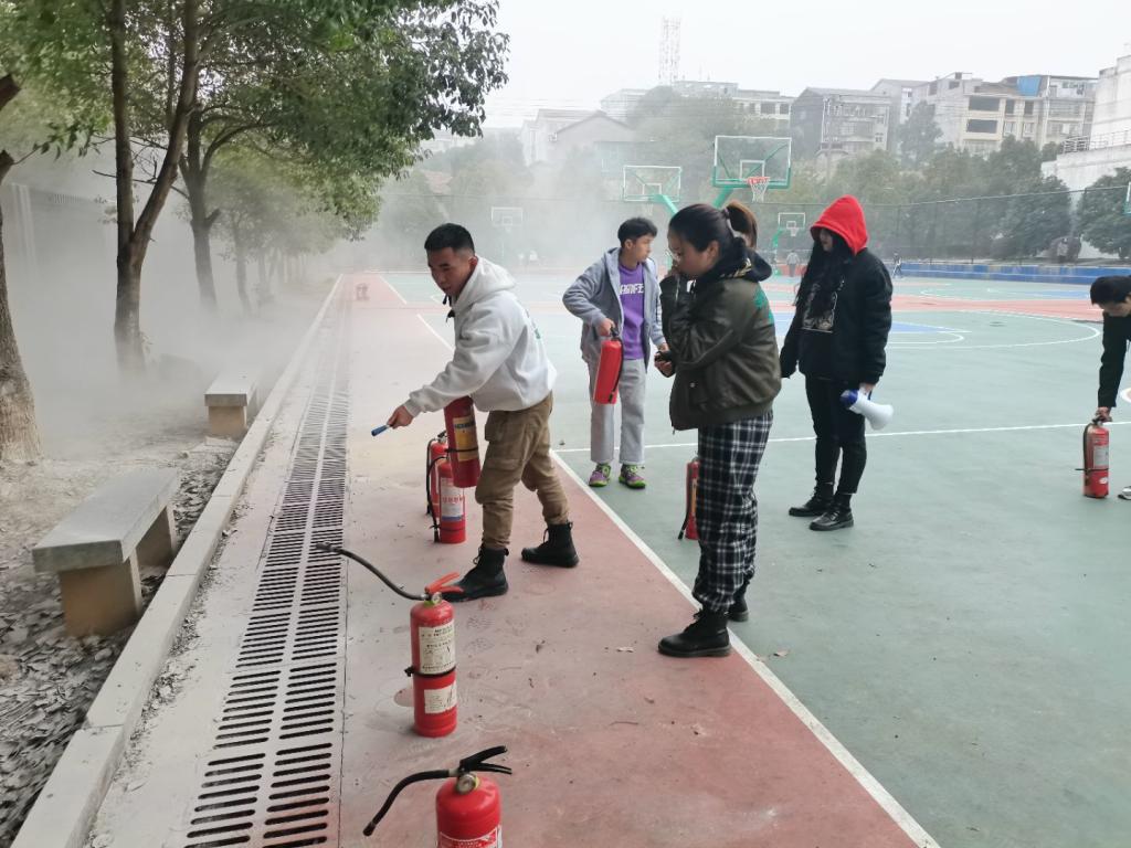 首先,武装部部长邱水勇介绍灭火器的正确使用方法。接着,他为同学们演示灭火器的正确操作步骤。最后,同学们轮流进行练习。