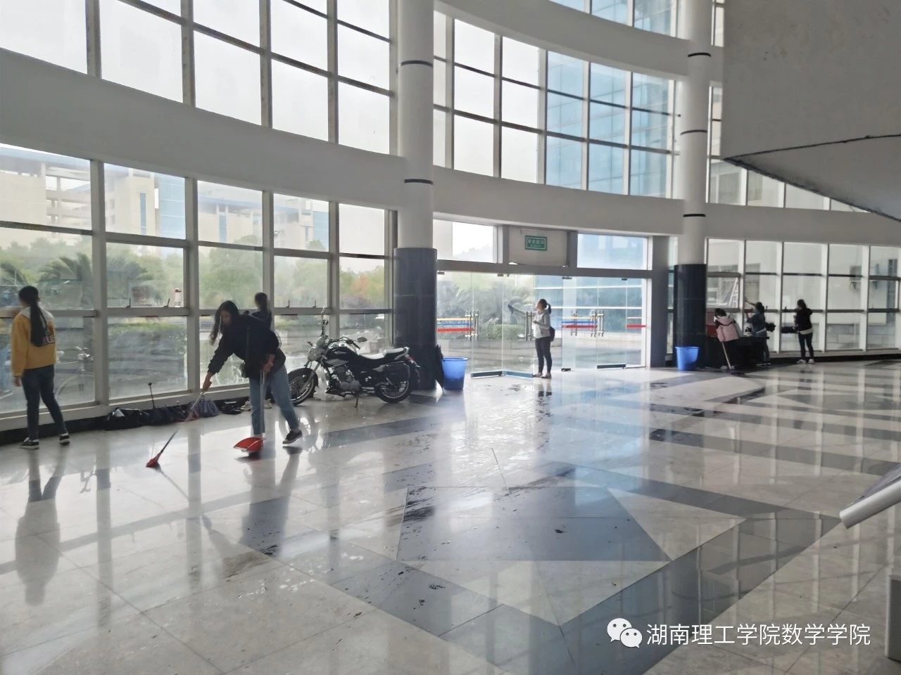 关注校园卫生,文明从我做起。活动中,同学们打扫了一楼大厅,清洁玻璃、教学楼平面示意图和课间书吧柜,认真清洁二楼和三楼的学校公共设施。同学将中央楼梯的扶手擦干净,对楼梯及地面仔细打扫了。