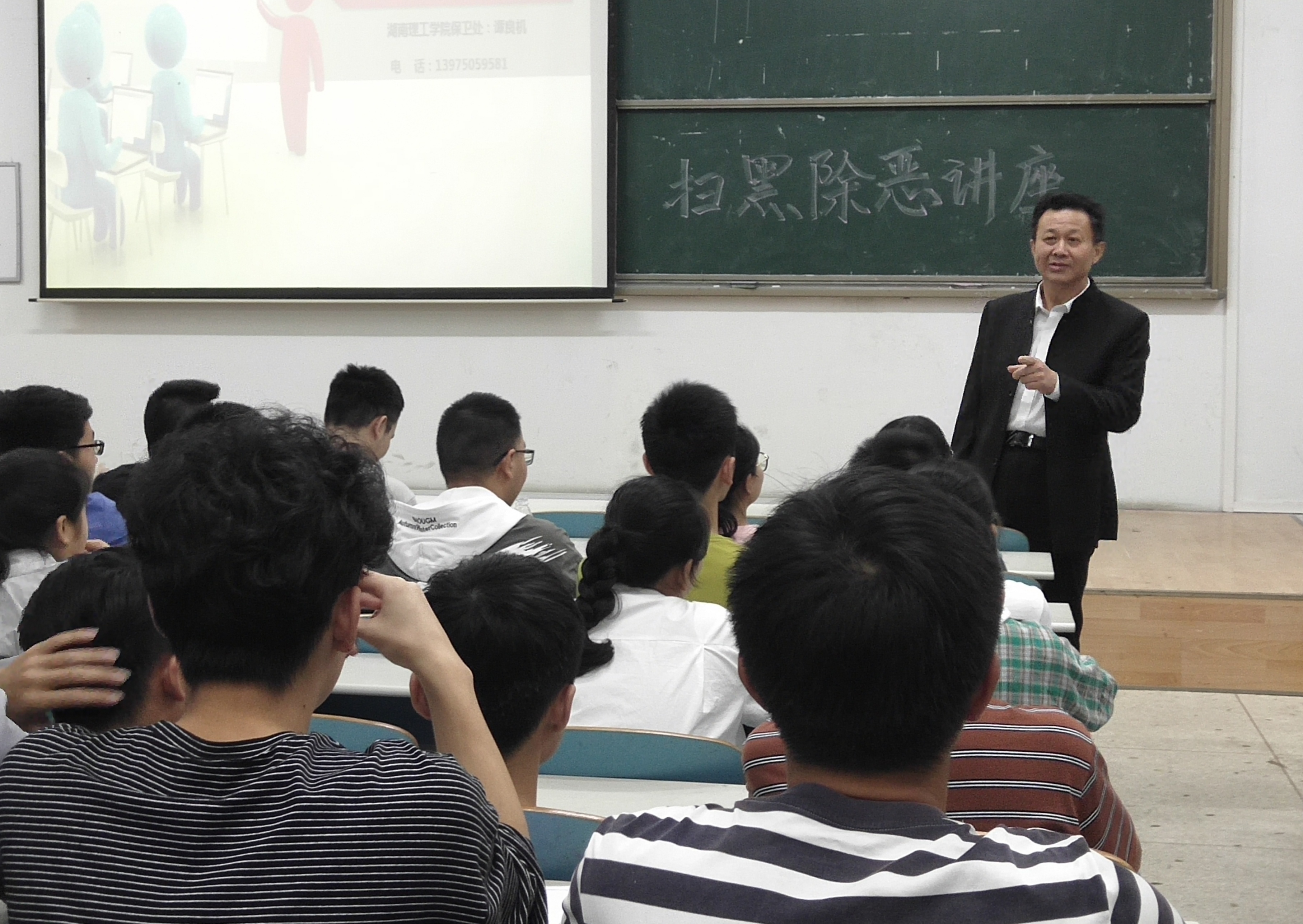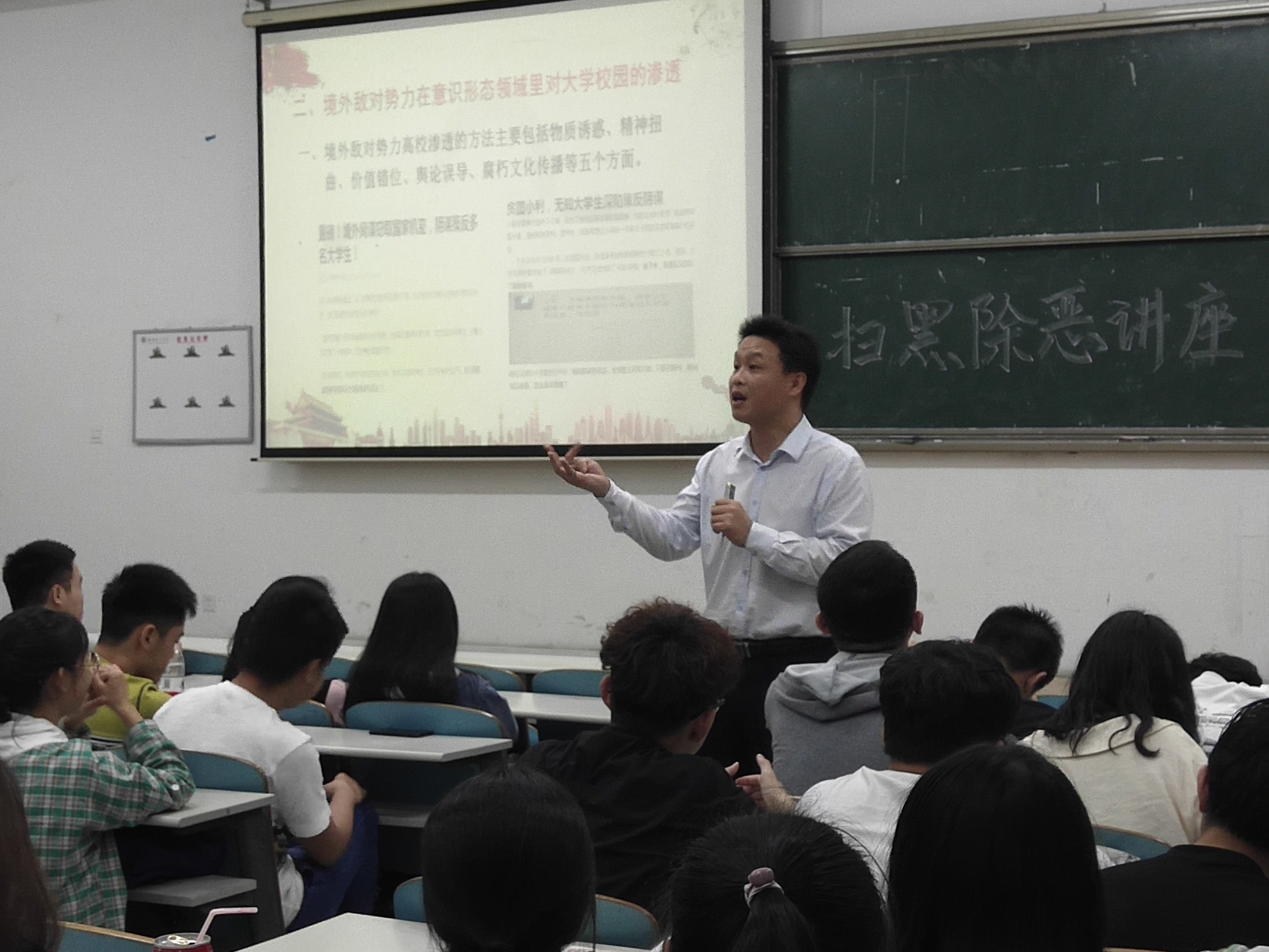 本站讯 本周二晚七点,开云kaiyun官方网站17、18级部分同学于9T1教室参加了反黑除暴安全教育讲座,此次讲座的主讲人为开云kaiyun官方网站保卫处谭良机处长,开云kaiyun官方网站党总支副书记易政群老师出席了本次讲座。