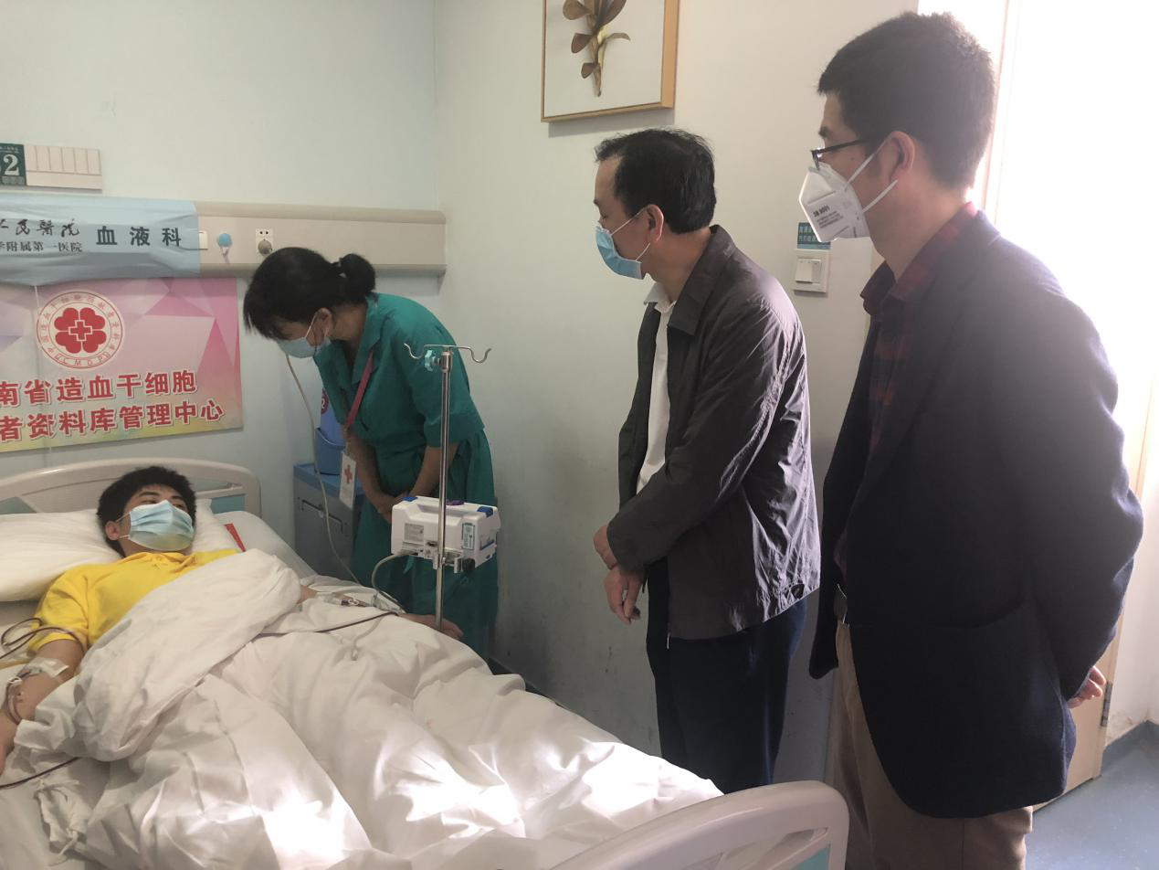 本站讯 4月29日,开云kaiyun官方网站18级信息与计算科学二班的周晨曦同学在湖南省人民医院进行了造血干细胞捐献。近十几年来,开云kaiyun官方网站开云kaiyun官方网站一直坚守与岳阳市血站的合作,给无数人传递了生的希望。周晨曦同学是开云kaiyun官方网站第一位进行造血干细胞捐献的学生。学校学工部副部长王云朋和开云kaiyun官方网站书记孙明保、副书记易政群、辅导员李哲君前往看望,并送上校长奖学金和学院慰问金。