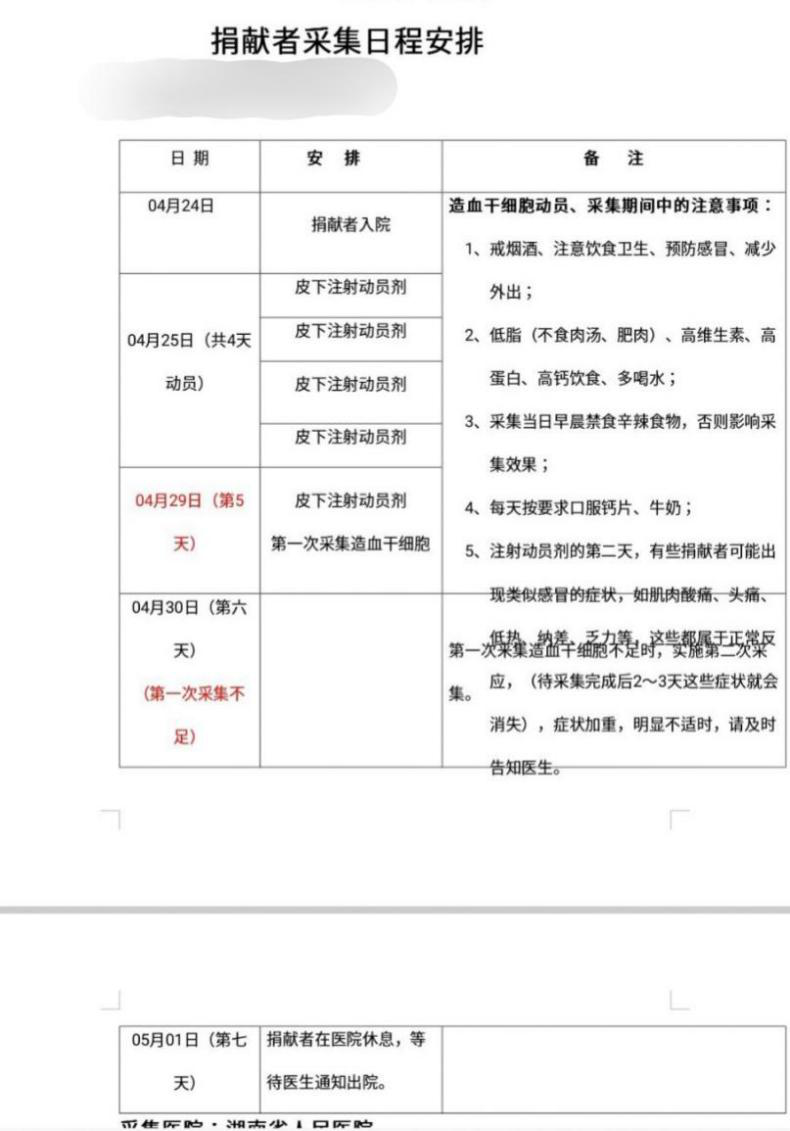4月24日,周晨曦来到湖南省人民医院开始注射第一天的动员针。“躺到抽血椅上的那一刻,或许是有护士和医生们温柔的安慰,之前走进医院时的紧张感好像立马烟消云散了,又或许是使命感让我觉得打动员针真的不那么痛。”