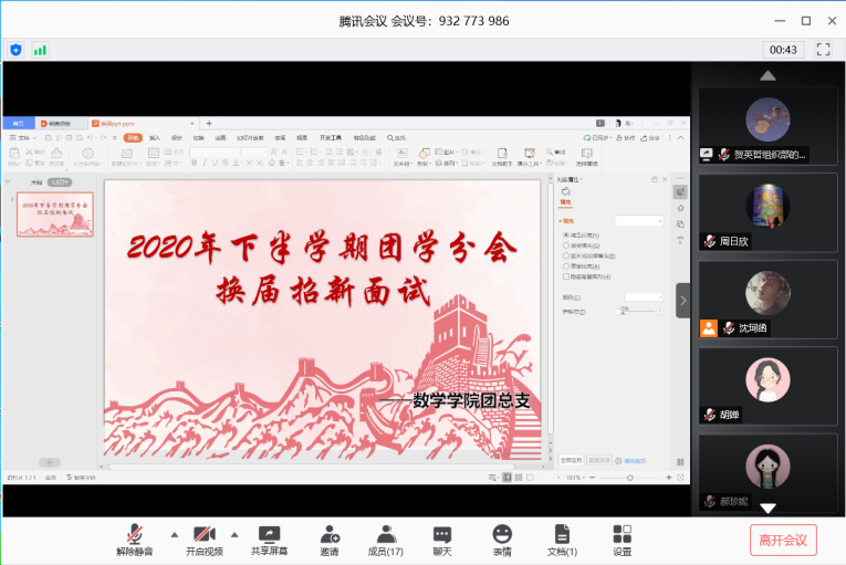 本次线上团学分会换届会议的顺利召开,确定了一批新的团学分会成员,同时数学学院注入了新的血液,带来了新的活力。面试前的紧张和焦虑必不可少,但这一次次的挑战都是对自己最大的认可,这不仅锻炼了干事们随机应变的能力,更是要求他们今后积极投身到工作中去,一同为建设更好更强的开云kaiyun官方网站而努力。