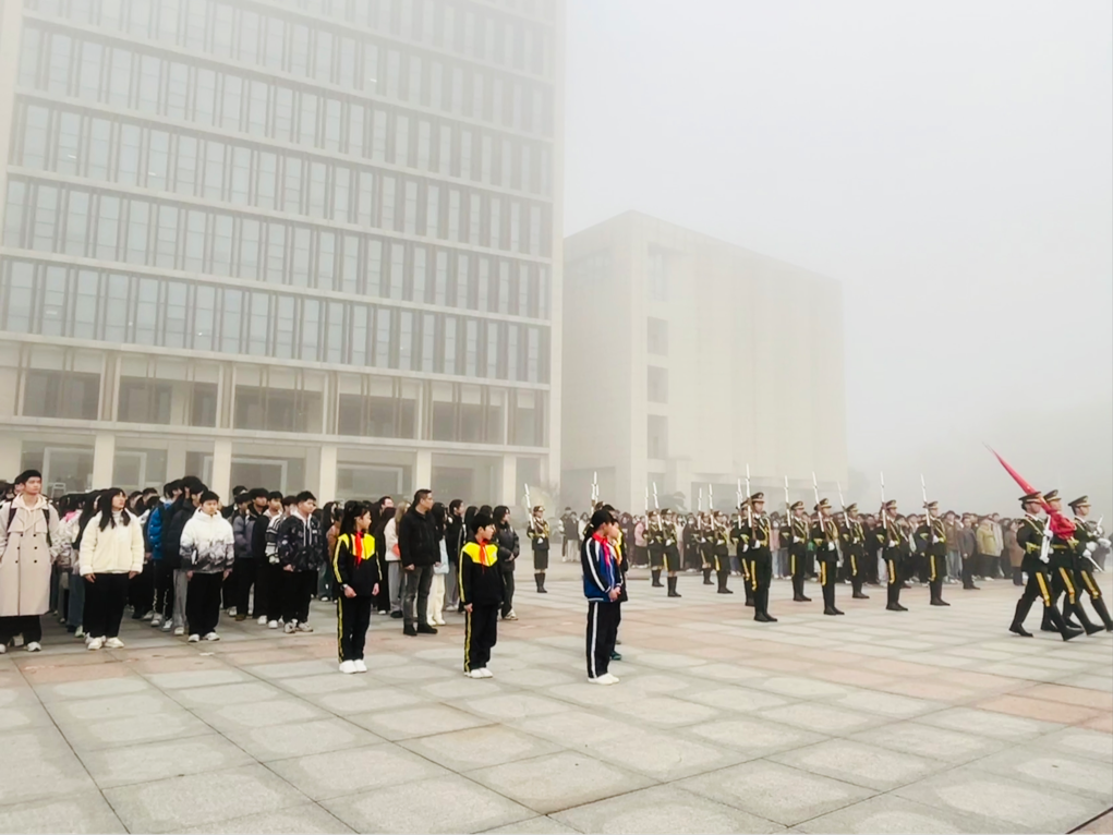 国歌嘹亮,国旗飘扬。国旗护卫队迈着矫健整齐的步伐走向升旗台。随着国旗冉冉升起,全体师生庄严肃立行注目礼,高唱国歌。