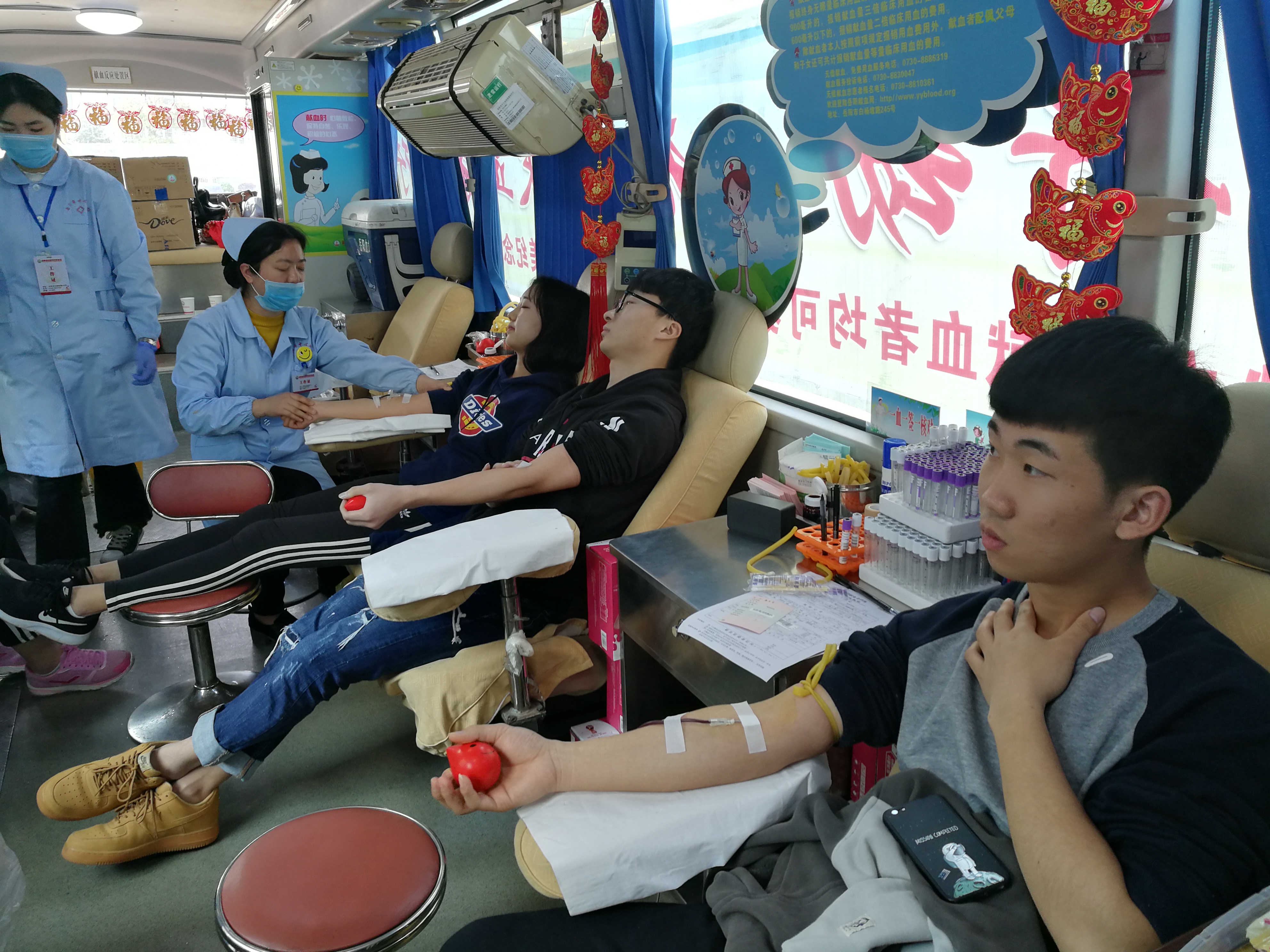在此次献血活动中,岳阳市中心血站的多位医护人员来到现场与同学们进行了零距离的接触,为同学们检查身体,普及献血知识等等。开云kaiyun官方网站青志中心志愿者以及团学分会的学生干部积极配合医护人员的工作,参与组织现场填表,维持现场秩序的工作。各位同学们积极参与其中,为公益献血事业贡献出自己的力量。